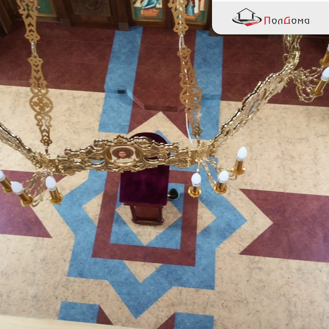 Монтаж выполнял строитель со стороны. Основанием послужила прочная фанера, обеспечивающая стабильность и ровность поверхности. Главным декоративным акцентом стала схема укладки с резкой и рисунком — индивидуальный узор, созданный специально под интерьер храма. Такое решение позволило подчеркнуть торжественность помещения и при этом сохранить практичность эксплуатации.
